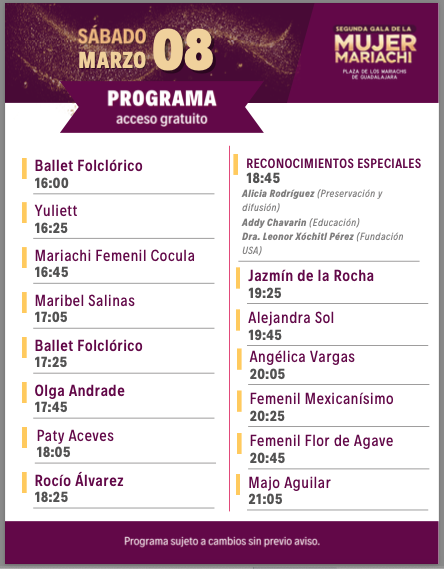 En el marco del Día Internacional de la Mujer, esta gala busca celebrar el talento y la contribución de las mujeres en la música mariachi. Contará con la presentación de mariachis y artistas de toda la República Mexicana, así como de Colombia y Estados Unidos.