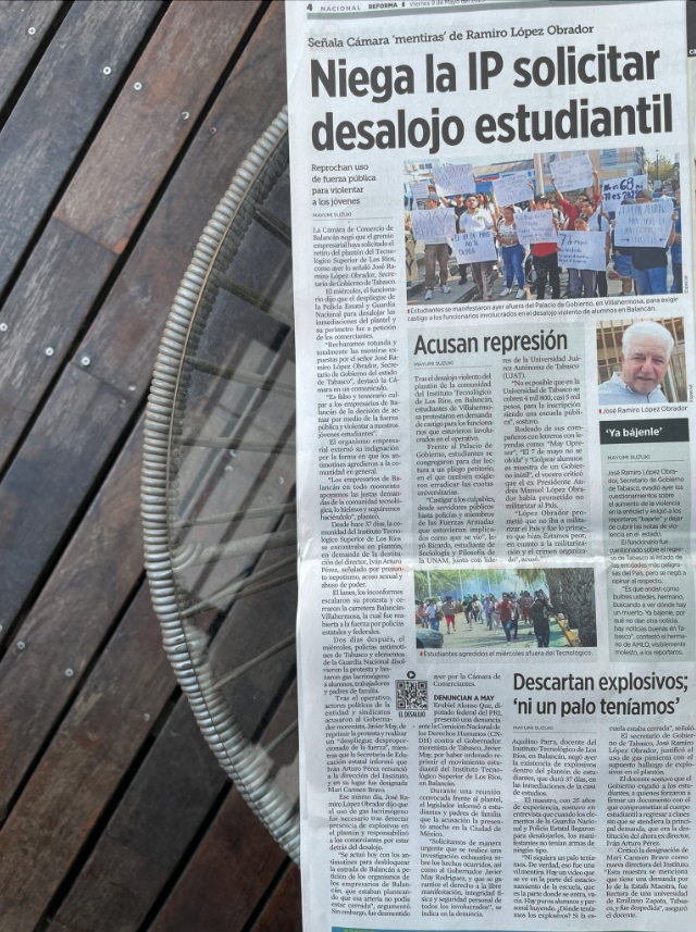 Policías estatales y guardias nacionales desalojaron con gas lacrimógeno y atacaron violentamente a estudiantes del ITSR de Balancán, a sus padres y maestros. Las víctimas aseguran que la orden fue directamente del Gobierno de Tabasco, de «garrotear» a los estudiantes que tenían tomado el Tec de Los Ríos Balancán exigiendo la renuncia del director.