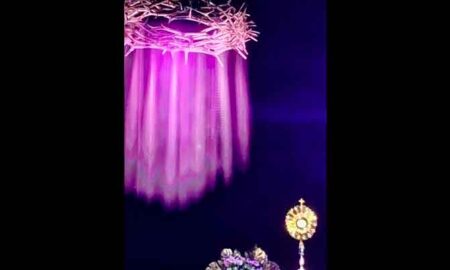 El escenario se ilumina pero toda luz cede ante una sola: la custodia que porta al Santísimo Sacramento colocada en el centro...