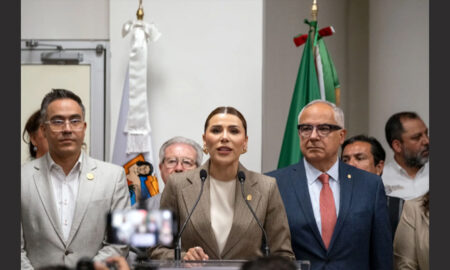 La gobernadora Marina del Pilar Ávila (centro), de Baja California, México, emite un comunicado sobre la revocación de su visa por parte...