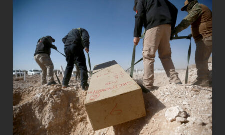 Funcionarios del servicio médico forense inhuman restos humanos no identificados en una fosa común cerca de Ciudad Juárez, Chihuahua, México, el 15...